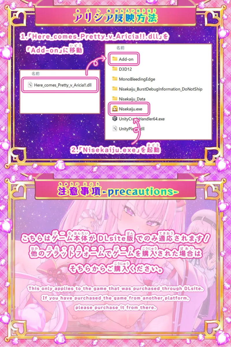 「Add-on」フォルダに「Here_comes_Pretty_v_Aricia!!.dll」を入れる