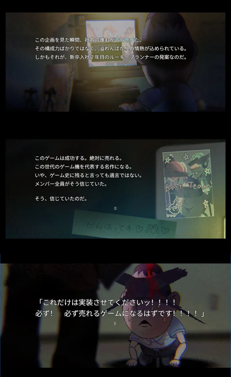 明るく軽薄な“ゲームパート”と、開発の闇を綴る“ストーリーパート”。この二つは交互に現れ、少しずつ噛み合わなくなっていく。