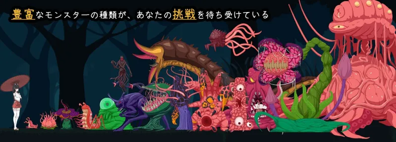 横スクロールピクセルアクションで、紅傘を駆使し妖魔を討て!