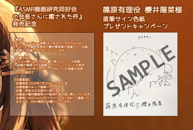DLsite様へレビュー投稿を「ゆなえ」のX(Twitter)アカウント(https://x.com/Yunae_ASMR )をフォローで、篠原有理役の櫻井陽菜様の直筆サイン色紙を抽選で2名様にプレゼントいたします。