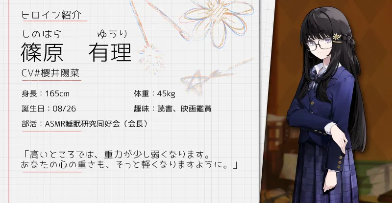 息抜きを求めて屋上へ向かったあなたは、ASMR睡眠研究同好会の会長・篠原さんと出会います。