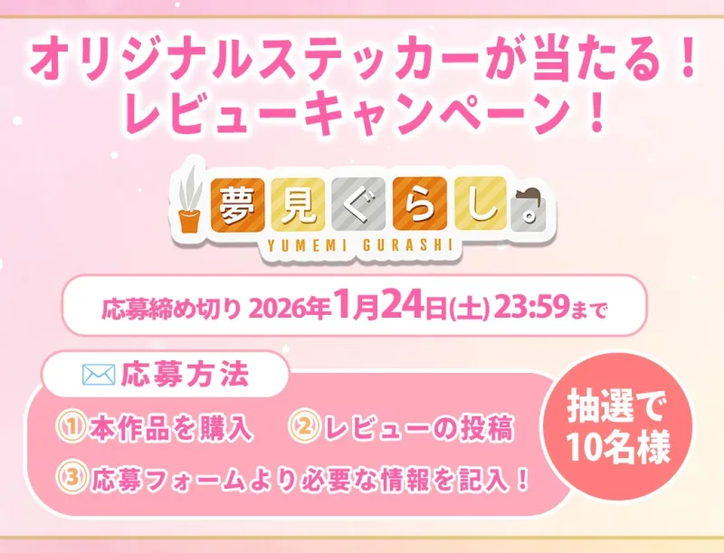 期間中にご購入のうえレビューをご投稿いただいた方の中から、抽選で10名様に「夢見ぐらし。」オリジナルステッカーをプレゼント!