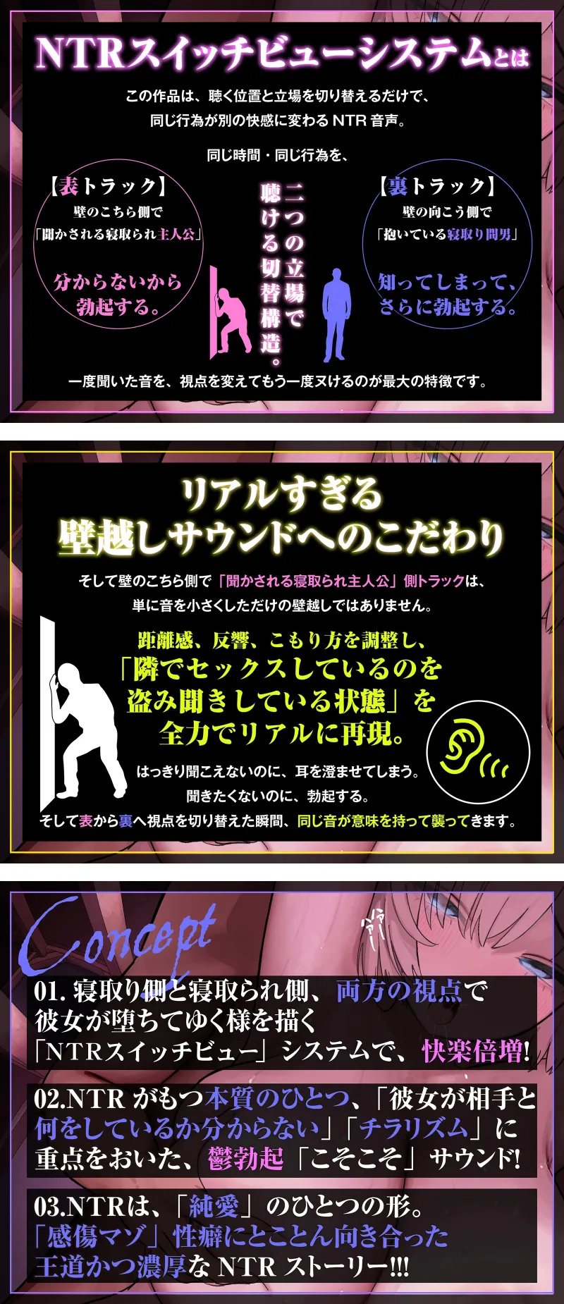寝取り側と寝取られ側、両方の視点から彼女の快楽堕ちを楽しむ「マルチバイノーラル」システムで、その臨場感&快楽は無限大に。