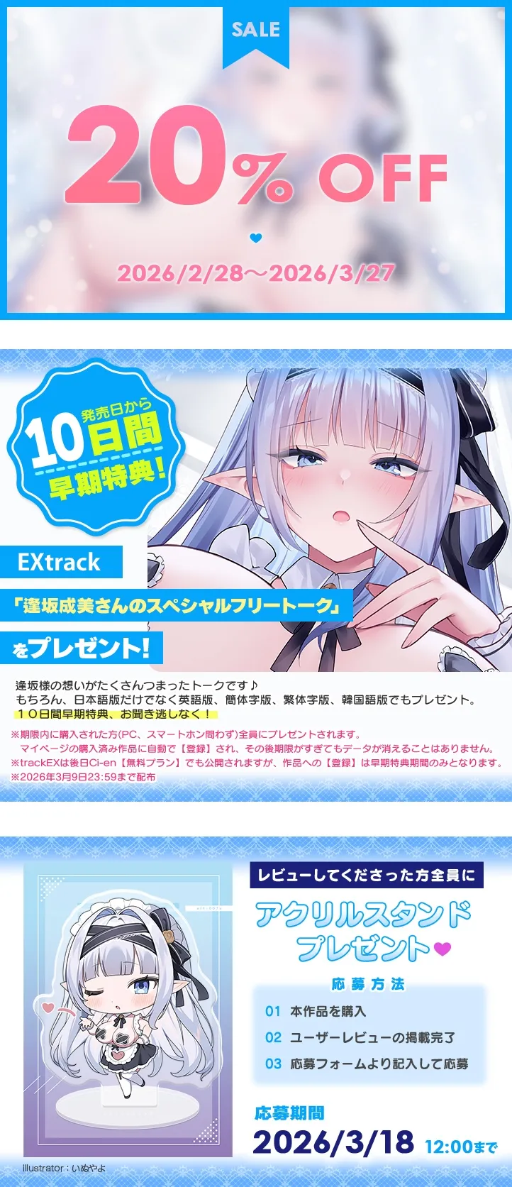 DLsite様、演者様、イラストレーター様、脚本担当様等、公式以外へのお問い合わせはお控えくださいませ。