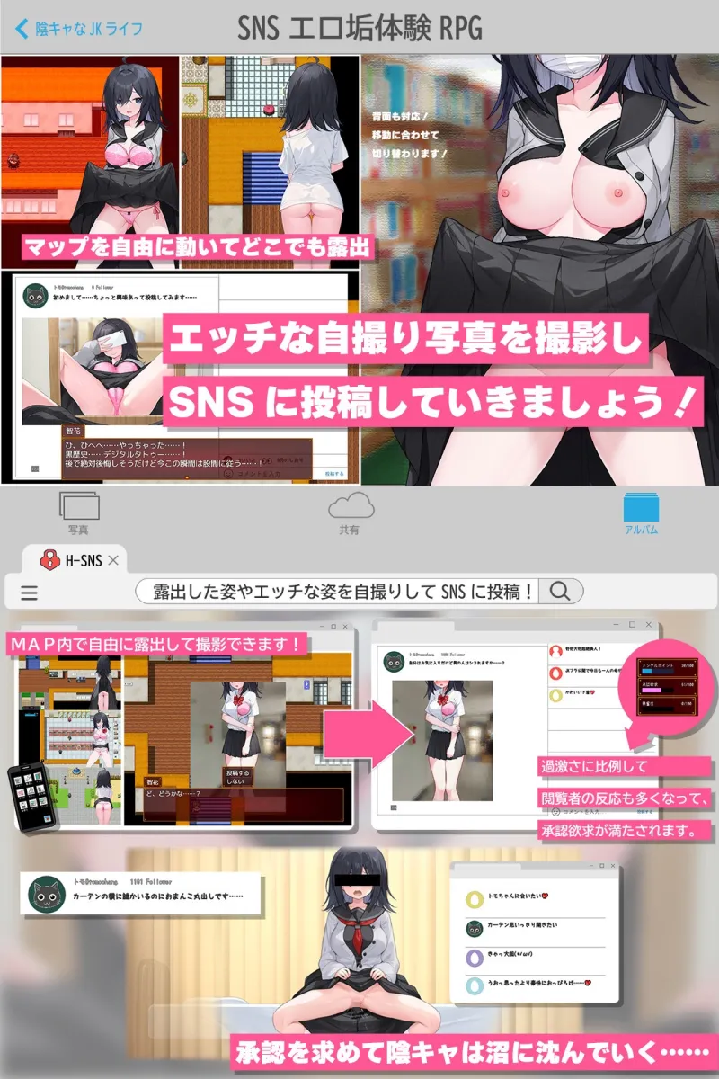女主人公を操作してエッチな自撮り写真を撮影し、SNSに投稿していきます。